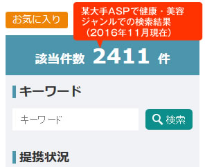 特に掲載サイトが不足しているのが、化粧品、サプリ、健康食品関連のプロモーションで、大手のアフィリエイトASPでは、「美容」「健康」キーワードで抽出すると2,000件以上のアフィリエイトプロモーションが検索結果に表示される状況です。