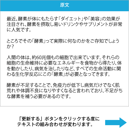 ランダムテキスト機能では、1行の文章を10の文節に分割し、各文節ごとに最大10個のパターンを用意した上で、それぞれの文節のパターンをランダムに組み合わせて、最大10,000,000,000通りの文章を生成します。